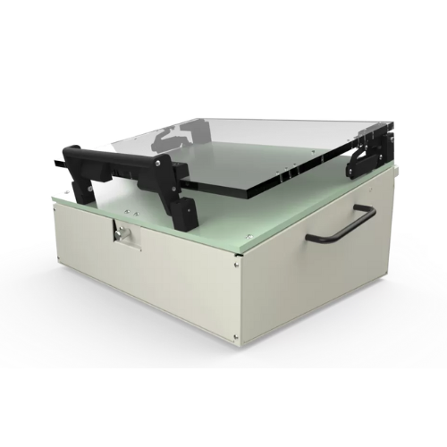 This series has a hinged polycarbonate top plate which, when latched closed, and using the supplied push fingers, puts a downward force onto the PCB and the test probes